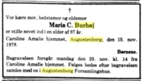 Maria Cathrine blev født i Skelde den 13.02.1891 og blev konfirmeret i Notmark i 1905. Hun blev gift med Nicolai Jacob Burhøj den 28.11.1913 i Asserballe kirke.
