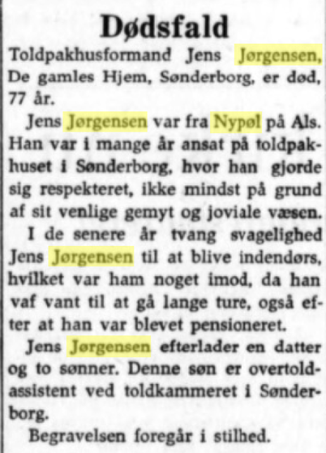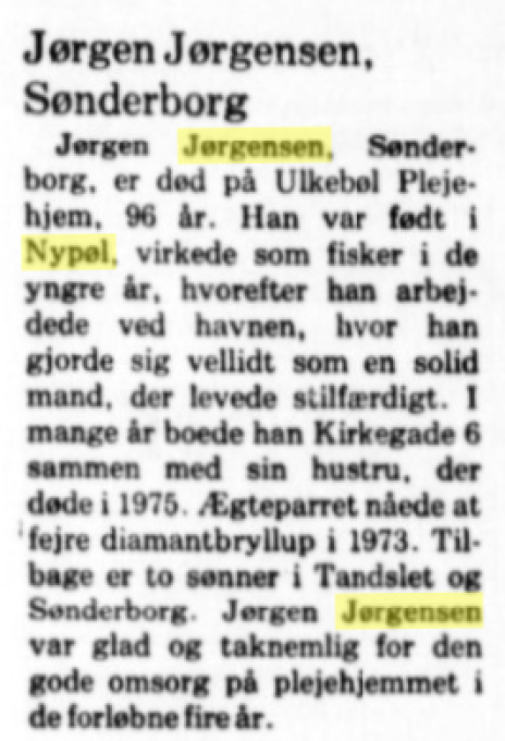 Jørgen Jørgensen dør 96 år gammel på Ulkebøl Plejehjem. Hustruen døde i 1973.