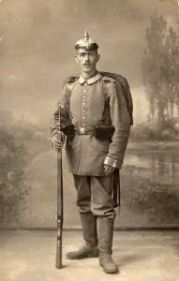 _ “Am 31.8.14 als Kriegsfreiwilliger bei Ersatz Landwehr Regiment 85 in Flensburg eingestellt und am 6.10.14 zu 1.Kompagnie Ersatz Regiment 84 in Schleswig versetzt. Am 27.11.14 mit einen Ersatz Transport ins Feld. Daher gestrichen. Jr.7696 M/15. (Akten: Einstellung der Kriegsfreiwilligen)